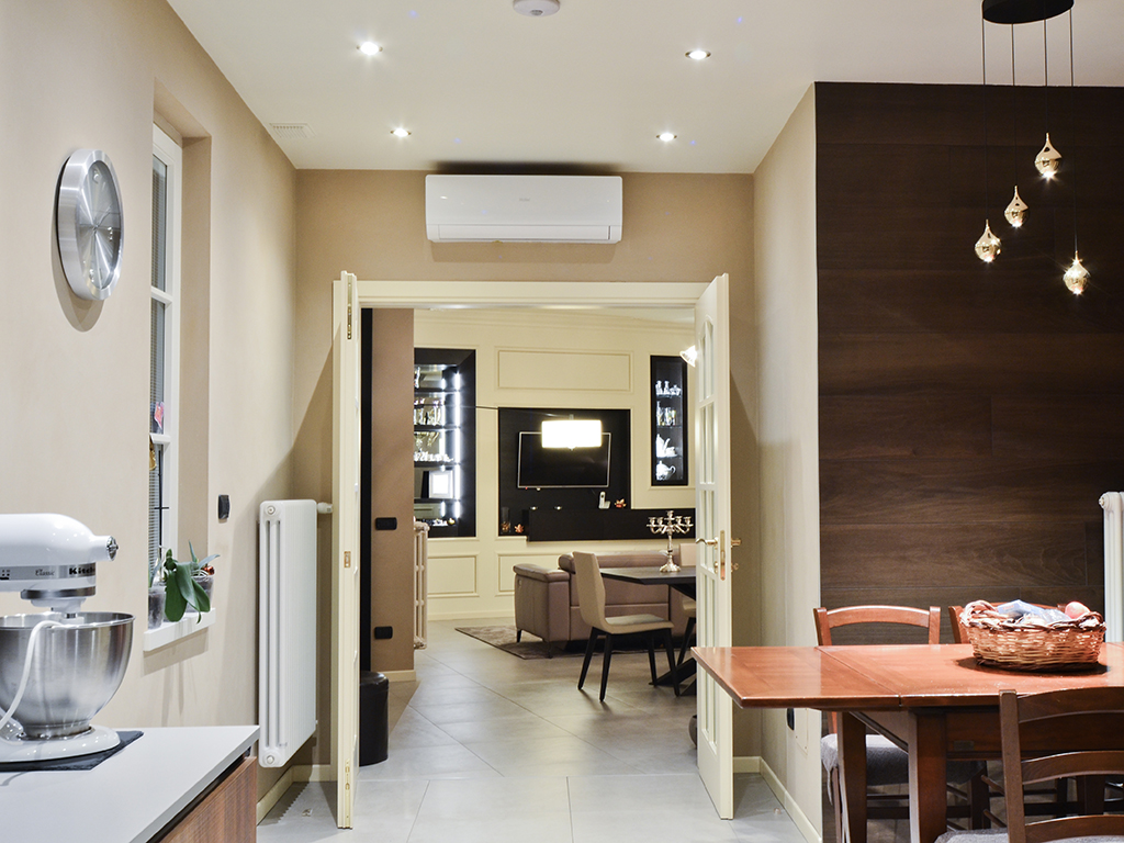 L’acquisto dell’appartamento adiacente a quello abitato è stato il pretesto, oltre che per la fusione dei due appartamenti, rivoluzionare l’appartamento esistente e per avere un aggiornamento di impianto idraulico, elettrico, sanitario. La casa che ne deriva è una residenza spaziosa, con una zona giorno importante e una cucina molto importante. La complessità del progetto è derivata dai numerosi vincoli strutturali e dall’unico punto in cui i due appartamenti potessero essere fusi: nonostante ciò siamo stati in grado di ricavare nei pochi metri aggiunti gli spazi che prima, nell’appartamento senza ampliamento, erano risicati ingrandendo la lavanderia, creando un bagno giorno, una lavanderia ed uno studio con accesso indipendente per il professionista di casa. Molta importanza è stata data alla privacy dei membri di casa e del professionista in occasione del lavoro di quest’ultimo.