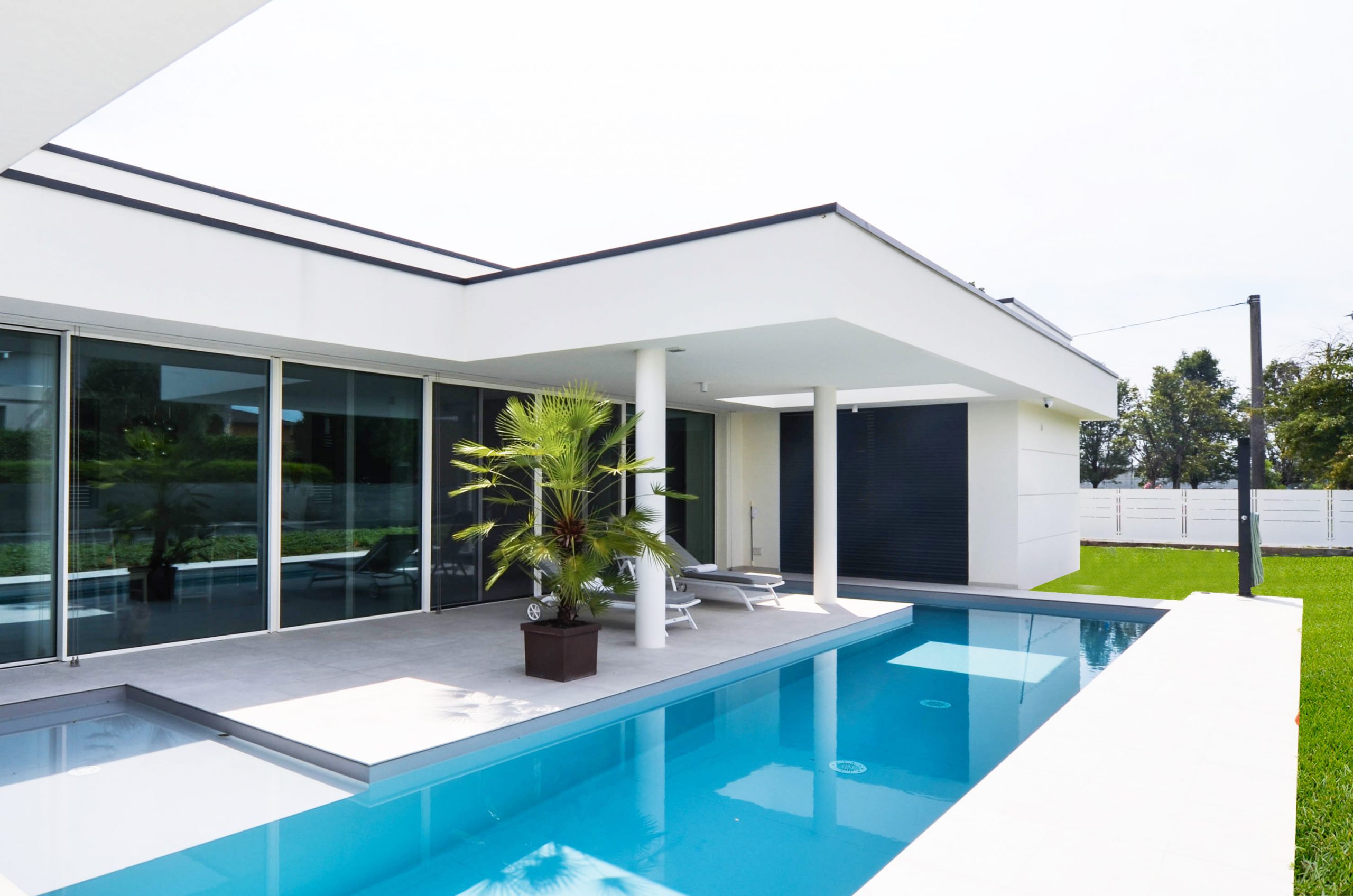 Il rapporto con un contesto fatto di ville unifamiliari ravvicinate, la volontà di schermarsi dalla strada di accesso alla zona residenziale ma, al contempo, di godere del giardino ci ha portato a realizzare una villa con una facciata volutamente fortemente ermetica verso la via pubblica, interrotta da patii che svuotano la struttura e permettono di traguardare lo sguardo, che fosse in netta contrapposizione con la facciata verso il giardino, quasi completamente vetrata, per consentire di non avere in limite definito dal rapporto pieni vuoti per la percezione dell’esterno. L’esterno è esso stesso parte del progetto. La zona giorno completamente vetrata affaccia sulla piscina dalla forma geometrica che ricalca la forma della corte principale di questo edificio a doppia dell’edificio, Le camere sono situate nelle parti della corte che si sviluppano dall’elemento centrale in cui, come detto, trova posto la zona giorno, e sono dotate di ampi serramenti che aiutano a mantenere il rapporto interno/esterno pur creando privacy.