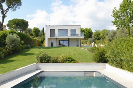 Il rapporto con un contesto fatto di ville unifamiliari ravvicinate, la volontà di schermarsi dalla strada di accesso alla zona residenziale ma, al contempo, di godere del giardino ci ha portato a realizzare una villa con una facciata volutamente fortemente ermetica verso la via pubblica, interrotta da patii che svuotano la struttura e permettono di traguardare lo sguardo, che fosse in netta contrapposizione con la facciata verso il giardino, quasi completamente vetrata, per consentire di non avere in limite definito dal rapporto pieni vuoti per la percezione dell’esterno. L’esterno è esso stesso parte del progetto. La zona giorno completamente vetrata affaccia sulla piscina dalla forma geometrica che ricalca la forma della corte principale di questo edificio a doppia dell’edificio, Le camere sono situate nelle parti della corte che si sviluppano dall’elemento centrale in cui, come detto, trova posto la zona giorno, e sono dotate di ampi serramenti che aiutano a mantenere il rapporto interno/esterno pur creando privacy.